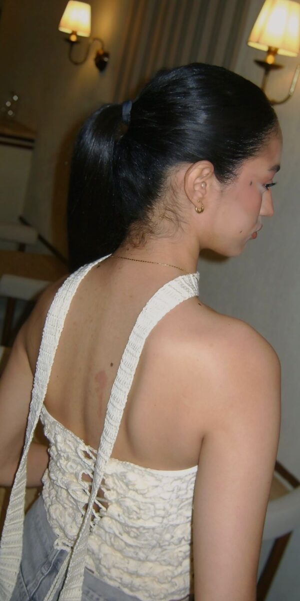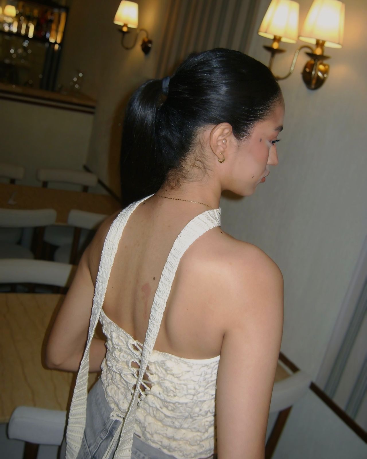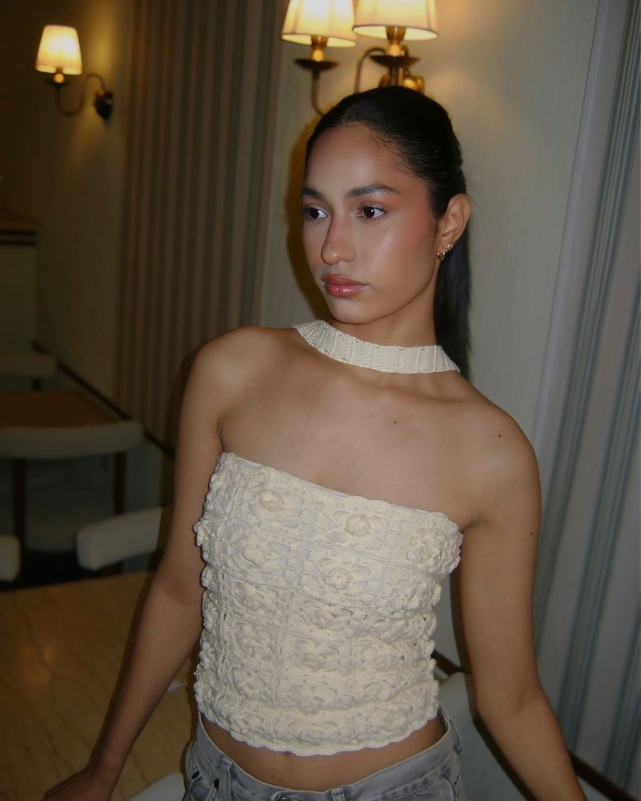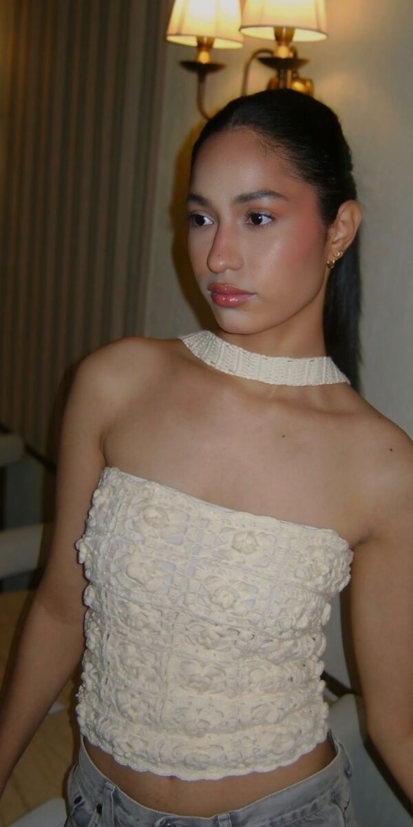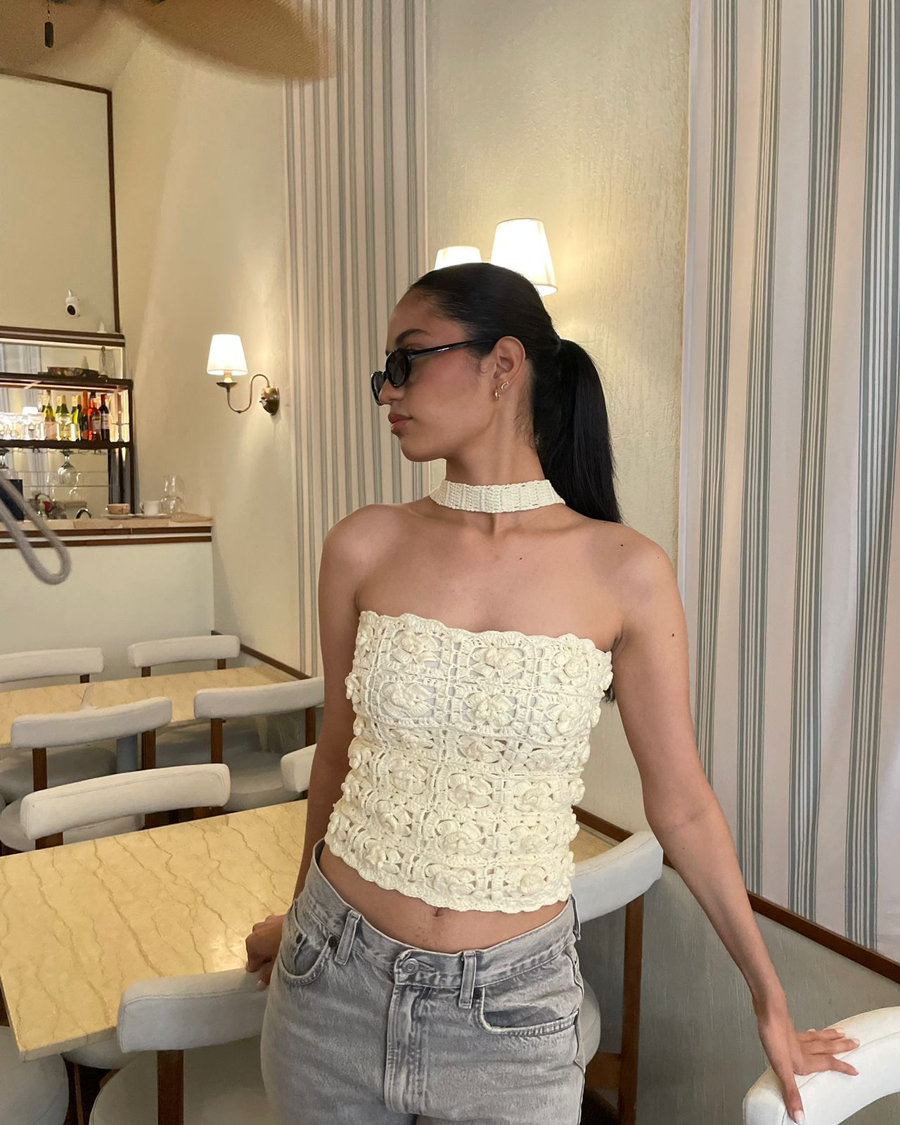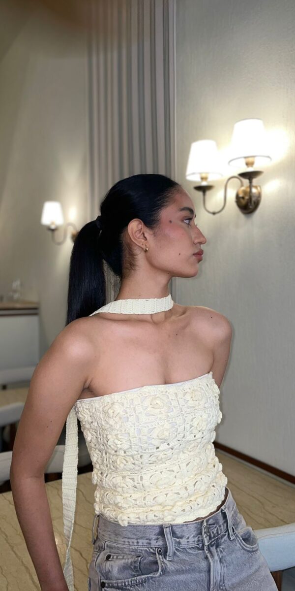 Top con detalles florales en alto relieve, tipo straple y bufanda larga sin textura.